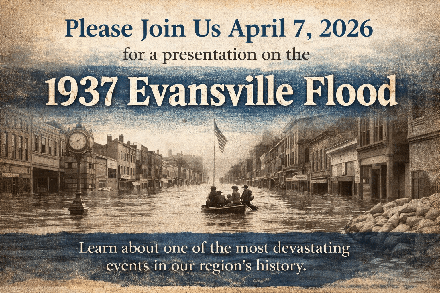 On April 7, 2026, join us for an engaging presentation about the 1937 Evansville Flood, its impact on our communities, and the stories of resilience from those who lived through it.